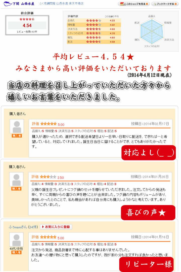 (原材料名)ふぐ(標準和名:シロサバフグ)(国産)、砂糖、還元水飴、醤油、醗酵調味料、ビーフエキス、おろししょうが、香辛料、食塩、オニオンパウダー/調味料(アミノ酸等)、増粘剤(加工でんぷん)、pH調整剤、(一部に小麦・大豆・牛肉を含む)