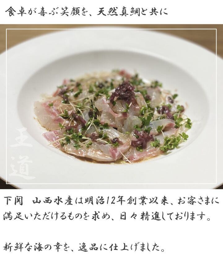 鯛の醍醐味を味わって下さい!天然真鯛をスライスし花盛りにしました。お好みの野菜を添え、添付のカルパッチョソースをかけるだけで素敵なオードブルが簡単に作れます。